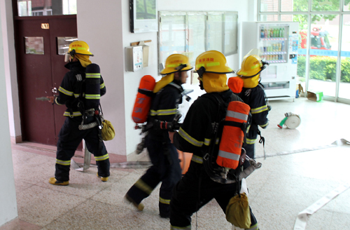 4月30日下午16时,模拟火情在黄色直播 一号教学楼发生。四辆大型消防车在黄色直播 治安保卫处工作人员引导下驶入黄色直播 ,停靠在一号教学楼旁。消防官兵们训练有素,整装待发。随着大队长的一声“开始”令下,消防兵们如离弦之箭,背着消防器材冲进了教学楼。只见他们兵分四路,第一路迅速地接通消防高压水龙头,控制水路;第二路来到大楼利用水枪控制烟雾;第三路队友对假想起火点进行控制火势;第四路队员进行搜救。在全体参演人员的配合下,火情被迅速控制并扑灭,演练取得了成功。