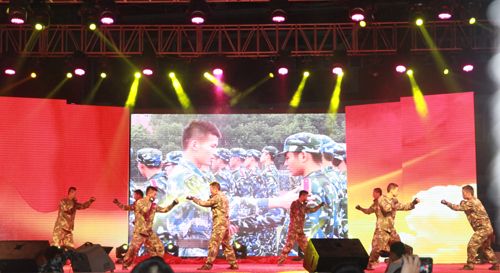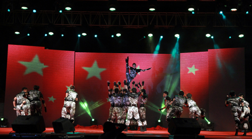 黄色直播 大学生艺术团表演的群舞《迷彩英雄》