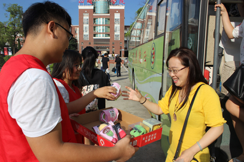 上午7:30分,由院团委组织的学生会、社联和青协的15名志愿者,手捧一份份精致可爱的“蛋糕毛巾”,站在校门口迎接各位老师的到来。7点45分,当校车缓缓驶进学校大门,车门打开的一瞬间,老师们一下子就置身在同学们的一声声“教师节快乐!”的问候声中,紧接着,同学们深情地向老师们送上了充满浓浓爱意的毛巾。一条毛巾既是精美的小礼物,也可以擦拭老师辛勤的汗水,小小毛巾寄托着同学们对老师的感谢之情。