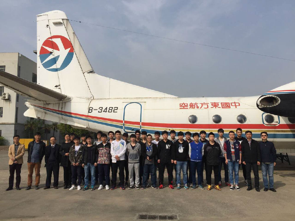徐飞主任(右二)、陈果主任(左三)与2014级航空机电设备维修班全体同学合影