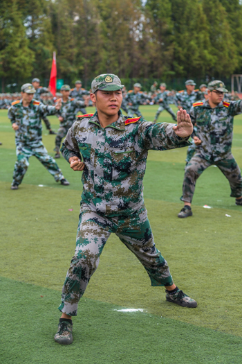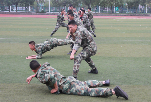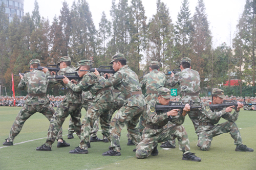 分列式结束后,军训团进行了男子擒敌拳、男子综合格斗术、女子匕首操科目汇报表演,集中展示了军训团的训练成果。在表演中,同学们展现出英勇无畏的气概,精彩的表演搏得了观众的阵阵掌声。军训团教官们也进行了小组战术、摔擒技术的军训科目表演,将现场气氛推向高潮。