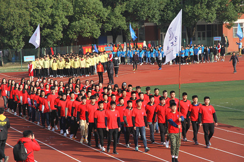 伴随着激昂的运动员进行曲,在校旗校徽、旗手的引领下,由各系学生代表组成的方队依次有序地走向主席台。他们以矫健的步伐、醒目的标语、响亮的口号,行进到主席台前时,分别以独具创意的形式,展示了各系的专业特色和同学们的精神风貌。全院教职工方队在各系学生代表方队之后入场,精神抖擞、斗志昂扬地通过了主席台。