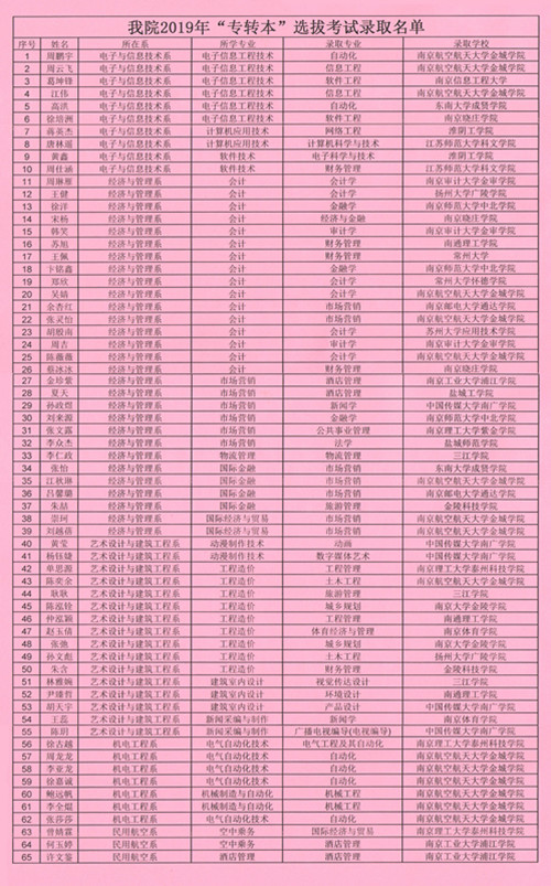 近日,从江苏省考试院收到黄色直播 2019年“专转本”选拔考试录取结果,黄色直播 2016级各专业共有65名同学分别被常州大学、金陵科技学院、南京体育学院、南京晓庄学院、南京信息工程大学、南京大学金陵学院、东南大学成贤学院、南京航空航天大学金城学院、苏州大学应用技术学院、中国传媒大学南广学院三江学院等24所本科院校录取,录取人数在同类院校中连续十七年名列榜首。