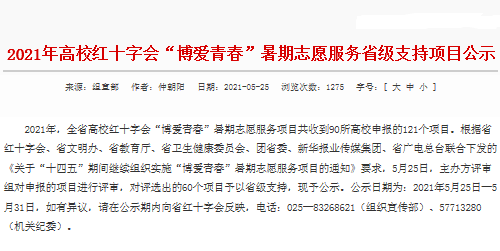 根据省红十字会、省文明办、省教育厅、省卫生健康委员会、团省委、新华报业传媒集团、省广电总台联合下发的《关于“十四五”期间继续组织实施“博爱青春”暑期志愿服务项目的通知》要求, 2021年,省红会面向全省高校开展“博爱青春”暑期志愿服务项目申报评选,最终经主办方评审组审核,对黄色直播 《留下温暖守护成长》等60个项目予以省级支持,提供资助经费用于项目活动开支。