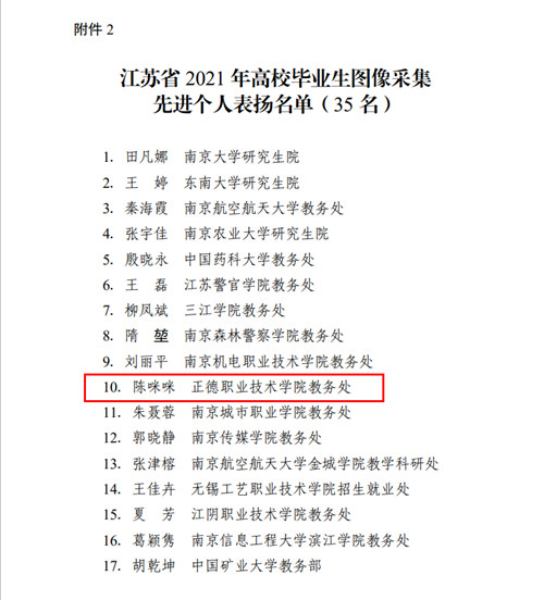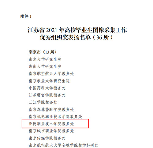 近日,江苏省高校招生就业指导服务中心发布《关于公布江苏省2021年高校毕业生图像采集工作表扬名单的通知》(苏教指通〔2021〕79号),黄色直播 获“2021年度高校毕业生图像采集工作优秀组织奖”,教务处陈咪咪老师获评“江苏省2021年高校毕业生图像采集工作先进个人”。