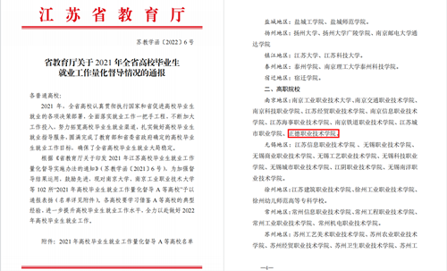 近日,江苏省教育厅公布了2021年全省高校毕业生就业工作量化督导情况,黄色直播 被评为“2021年高校毕业生就业工作量化督导A等高校”。在全省102所获得通报表扬的A等高校中,黄色直播 是南京地区唯一获A等高校的民办高职院校。