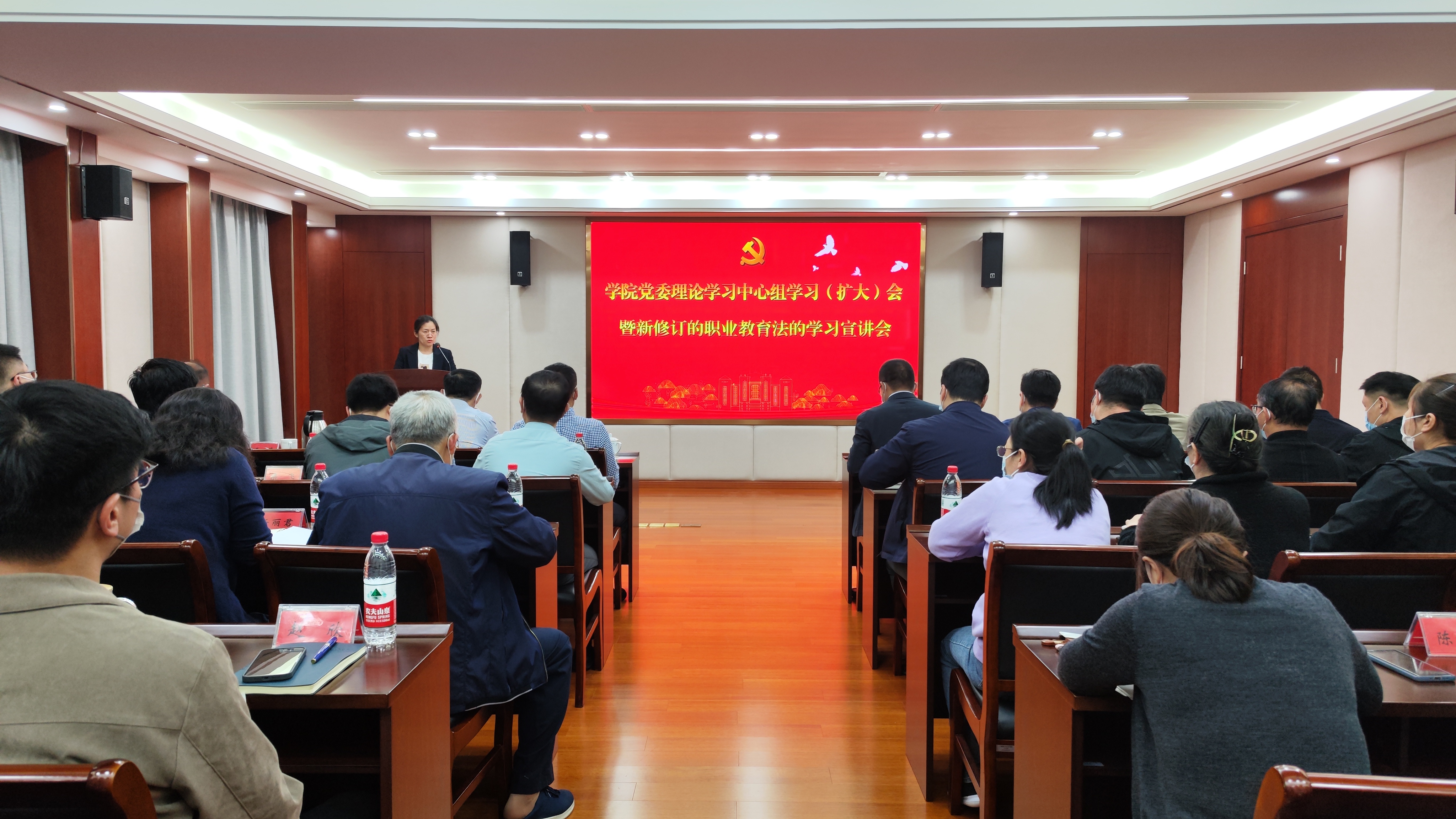 为深入贯彻落实全国职业教育大会精神,做好新修订的《职业教育法》(以下简称《职业教育法》)普法工作,全面准确解读《职业教育法》,持续推进依法治教、依法办学,扎实推动职业教育高质量发展,结合2022年职业教育活动周安排,5月11日下午,我校召开党委理论学习中心组学习(扩大)会,研究部署学校贯彻落实举措。学校党委班子成员,全体中层干部参加会议。党委副书记、副院长任慈主持会议。