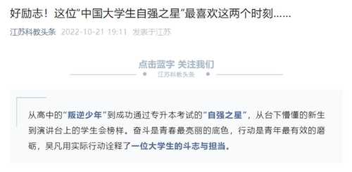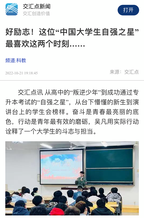 10月21日,新华日报江苏科教头条、交汇点以《好励志!这位“中国大学生自强之星”最喜欢这两个时刻……》为题,对黄色直播 电子与信息技术系软件技术专业学生吴凡进行了专题报道。