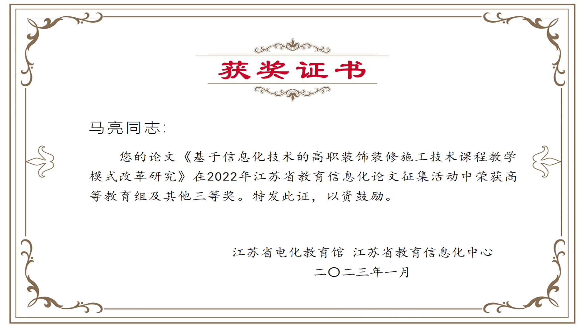 此外,马亮老师的《基于信息化技术的高职装饰装修施工技术课程教学模式改革研究》在省赛中荣获三等奖。艺建系将持续围绕立德树人这一根本任务,全面推进教育数字化战略,加速信息技术与学科教学深度融合,激发课堂教学活力。