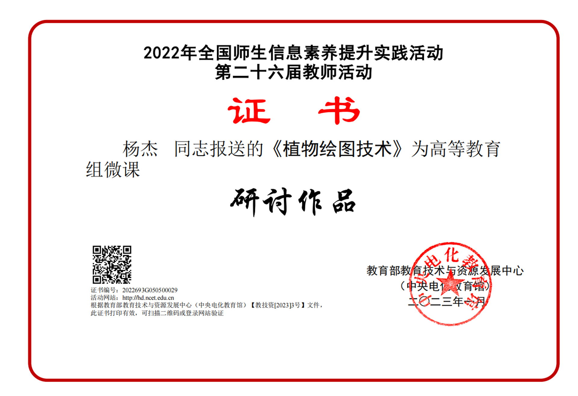在近日由教育部教育技术与资源发展中心 (中央电化教育馆)主办的2022年度教育技术微课活动,黄色直播 艺术设计与建筑工程系杨杰老师的微课《植物绘图技术》荣获“研讨作品”。本届微课活动是由“省赛-国赛”的竞赛体系构成,省赛获奖的作品经遴选后,送往国赛进行竞赛。