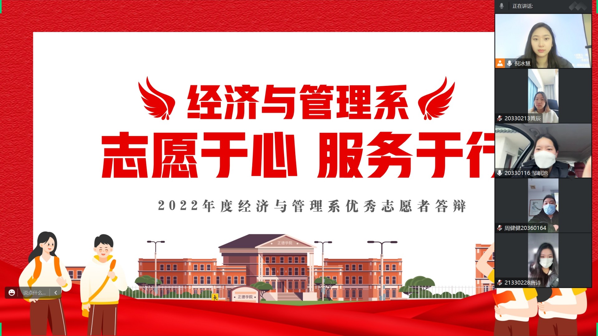答辩过程中,倪冰慧对志愿者们的责任感和奉献精神给予了充分的肯定,就志愿者的个人情况和志愿经历进行提问,并提出宝贵建议。接着,她指出了经济与管理系志愿工作后续的方向,勉励他们与经管系青年志愿者协会继续在志愿服务道路上结伴同行、勇毅前行。