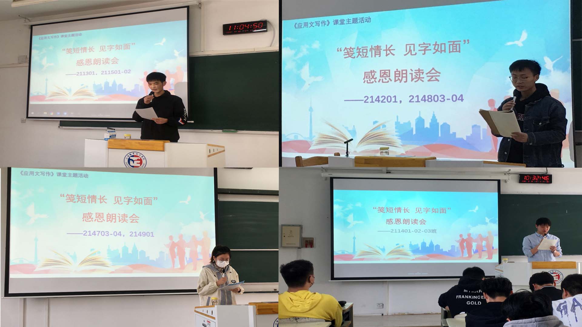 近两年,应用文写作教学团队多次进行集体备课,认真研讨如何在《应用文写作》课程更好地开展课程思政,通过信息化教学模式,采用情境教学法、项目教学法、主题活动法等多种教学方法和手段,结合不同文种的讲解,融入不同的思政元素,更好地为育人服务。本次“感恩朗读会“主题活动是课程思政和美育教育的巧妙结合和成功落实。