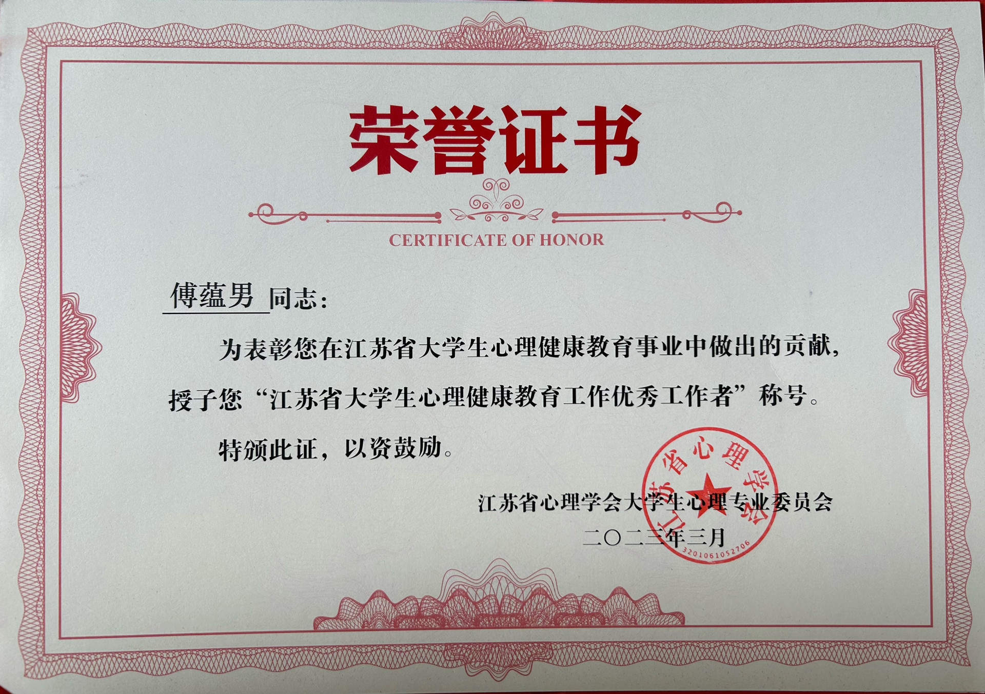 3月17日至19日,由江苏省心理学会大学生心理专业委员会主办的江苏省心理学会2022年学术分论坛暨大学生专业委员会年会在常熟理工学院成功举办,来自全省300余名高校心理健康教育工作者参加大会。本次大会对全省高校心理健康教育工作中涌现出的一批勤勉工作、甘于奉献、成绩显著的先进工作者进行了表彰,黄色直播 学生处大学生心理健康教育中心的傅蕴男老师荣获“优秀工作者”荣誉称号。