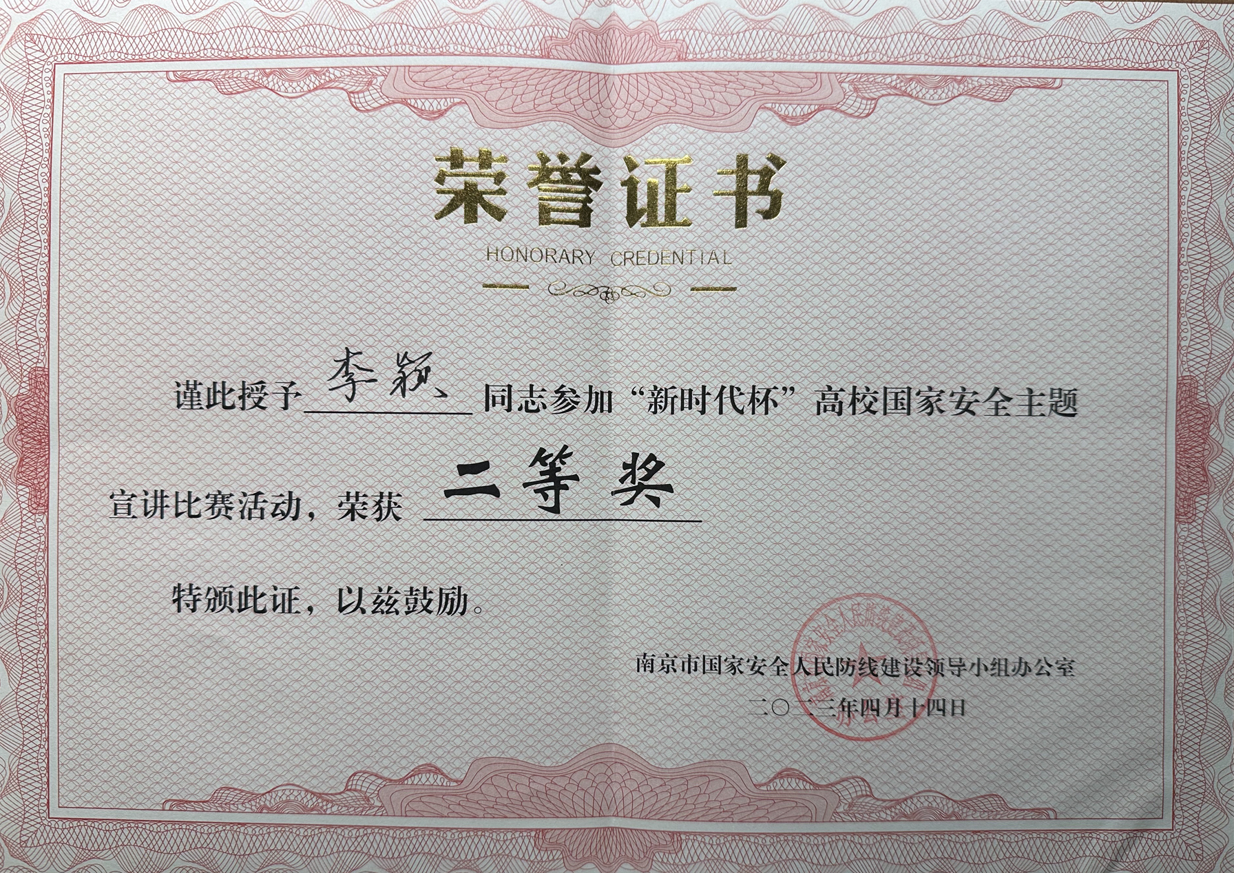 今年的4月15日,是第八个“全民国家安全教育日”。4月14日,“新时代杯”高校国家安全主题宣讲比赛在江苏警官学院进行,黄色直播 思政教研部李颖老师在30名在宁高校选手中总分位列第五名,荣获二等奖。