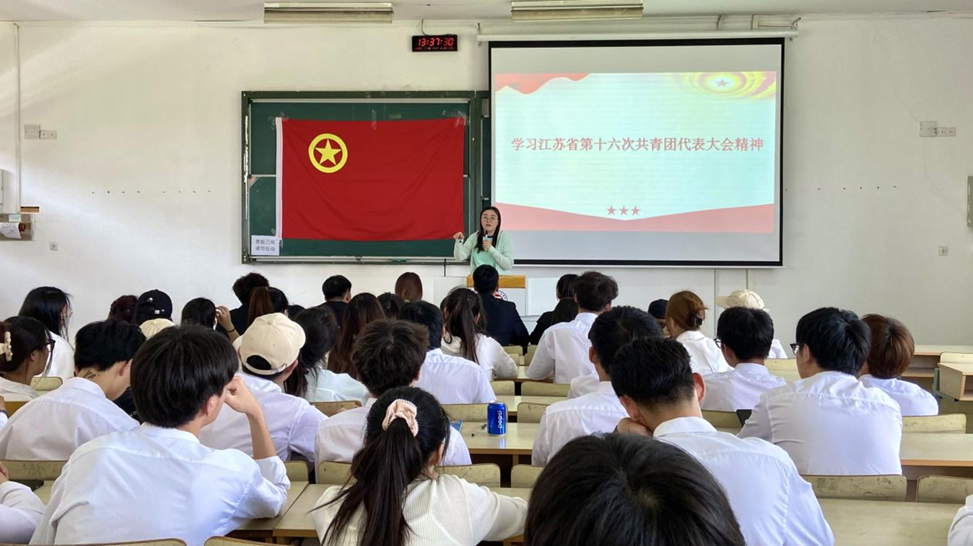 回望百年,青春向党,青年是这个时代蓬勃发展的重要力量。为深入学习贯彻习近平新时代中国特色社会主义思想,引导同学们不断锤炼政治品格,坚定对党的信仰,强化责任担当,切实履职尽责,4月19日在1303教室组织各班团员集体观看习近平总书记关于青年、教育重要讲话视频并开展交流发言,引导大家坚定理想信念、矢志青春向党,勇担时代责任、奋力拼搏进取。会议最后团总支书记陈瑶老师传达学习共青团江苏省第十六次代表大会精神。