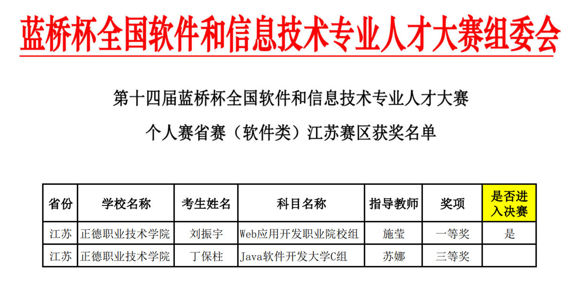 在第十四届“蓝桥杯”个人赛省赛(软件类)江苏赛区中,电子与信息技术系软件技术专业2021级学生刘振宇获省级一等奖、丁保柱获省级三等奖。其中,Web应用开发项目为黄色直播 首次参赛,获得历史性的突破,并闯入全国总决赛。