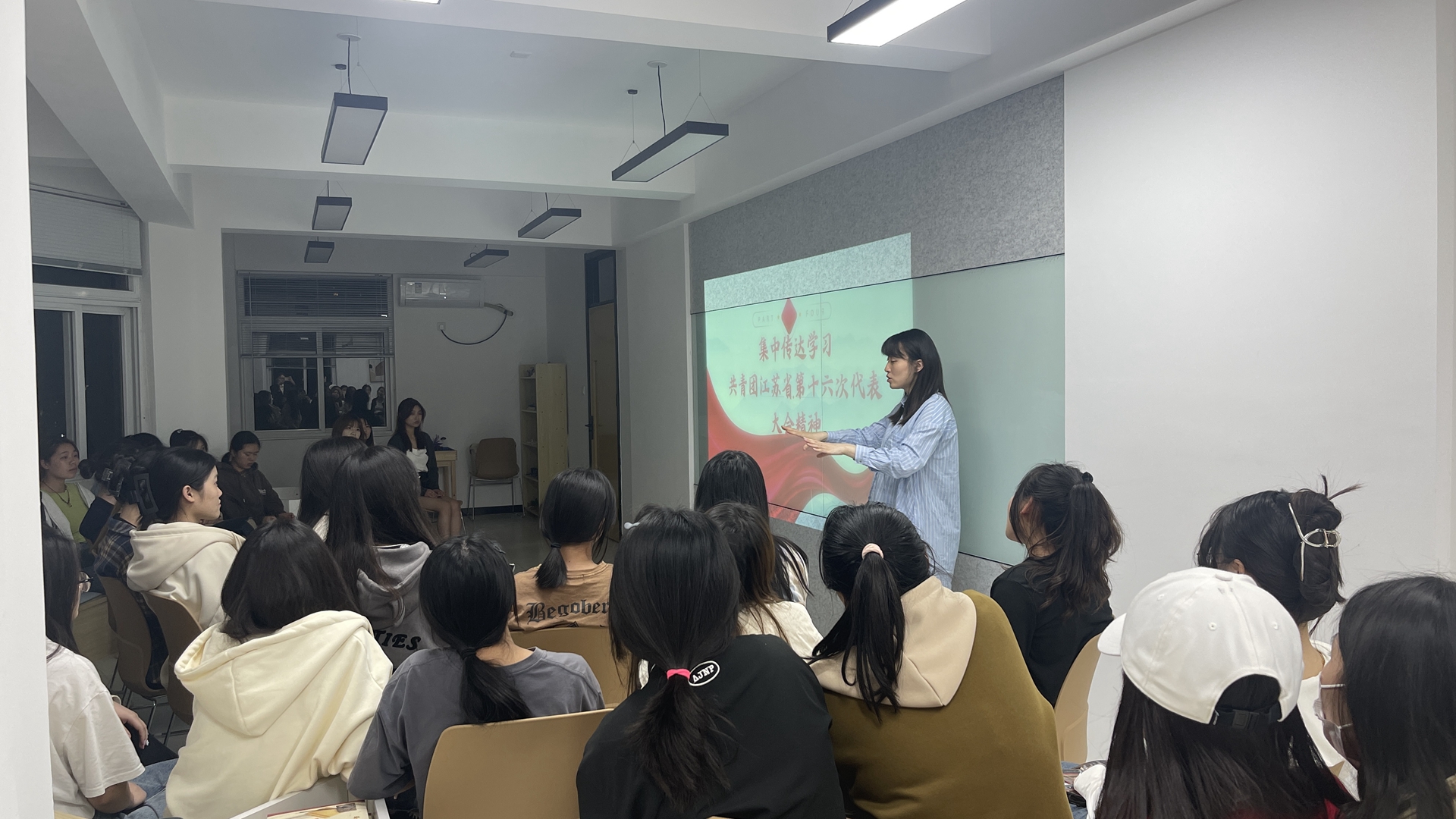 共青团江苏省第十六次代表大会是在全省上下深入学习贯彻党的二十大精神和习近平总书记参加全国人代会江苏代表团审议时的重要讲话精神,奋力推动高质量发展走在前列的重要时刻召开的一次青春盛会,系团总支书记魏玮向学生传达学习此次大会精神,并就评选院“两红两优”、开展五四主题团日等下一阶段共青团工作进行了动员和部署,要求各团支部紧密围绕院中心工作,凝心聚力、开拓创新,有规划、有方向的开展各项工作,高质量完成团组织建设任务,不断提升共青团工作水平,更好地服务广大团员青年。