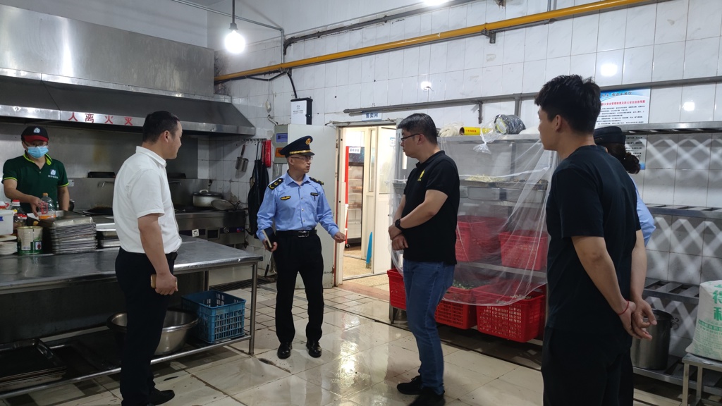 为进一步强化学校食堂食品安全管理,落实食品安全主体责任,加强食品安全风险防控,杜绝食品安全事故,保障就餐师生员工的安全健康,5月24日后勤处邀请江宁开发区市场监督管理局副局长任有海等一行人,到学院各食堂检查指导食品安全工作。后勤处处长查理、副处长张智灏全程陪同检查。