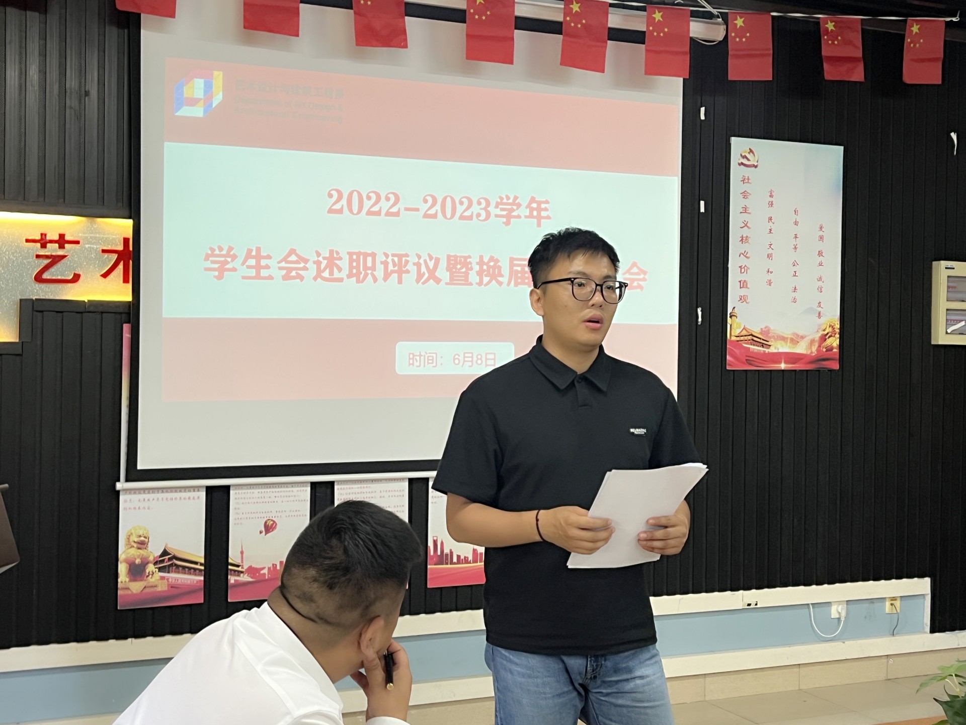 为贯彻落实党的二十大精神、全国学联二十七大第二次全体会议精神,加强创新力度、顺应改革新风,落实《黄色直播 学生会改革实施方案》,艺术设计与建筑工程系于8204教室召开学生会述职评议大会暨聘书颁发。出席本次会议的有艺建系党支部书记陈宏波,团总支书记崔杰,学生会全体成员参加。
