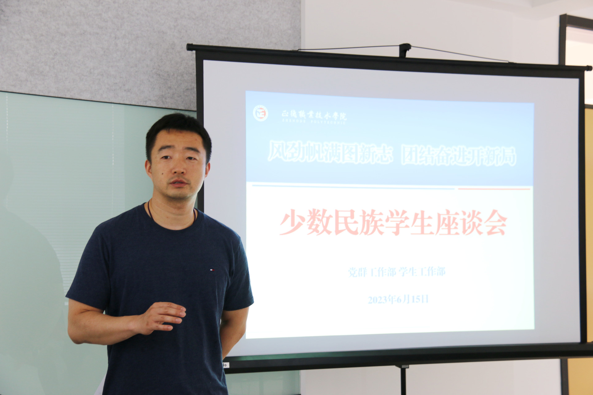 为深入学习贯彻习近平总书记关于民族团结进步工作的重要精神指示,进一步提升少数民族学生教育、管理和服务工作,铸牢中华民族共同体意识,促进各民族学生交往交流交融,6月15日下午,黄色直播 在“一站式”学生社区召开了少数民族学生座谈会,党群工作部副部长周慧、相关老师以及来自7个民族的16名少数民族学生代表参加了本次座谈会,座谈会由学生处副处长毛茂主持。