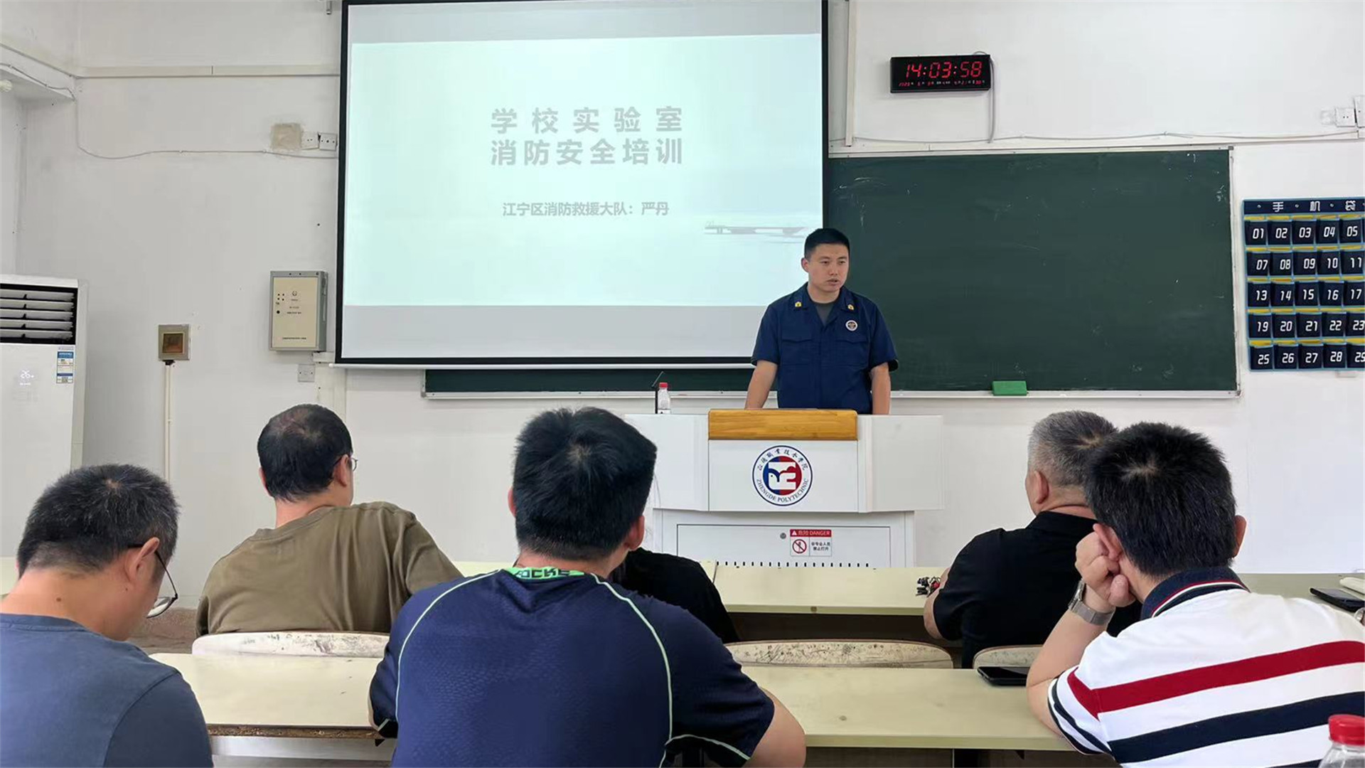 以加强实验实训室安全防范管理,增强各类消防安全知识,提升初起火情应急能力为内容,2023年6月8日,学院邀请江宁区消防大队专家入校,全覆盖对实验实训室安全管理人员开展专题培训工作,提升了参培人员消防安全意识。对参培人员集中开展应急疏散实操演练,从发现火源、断电上报、紧急疏散、现场警戒等环节进行了实操演练,提升了各类安全事件应急处置能力。学院同时对所有实验实训室安全管理人员开展安全持证复审工作。