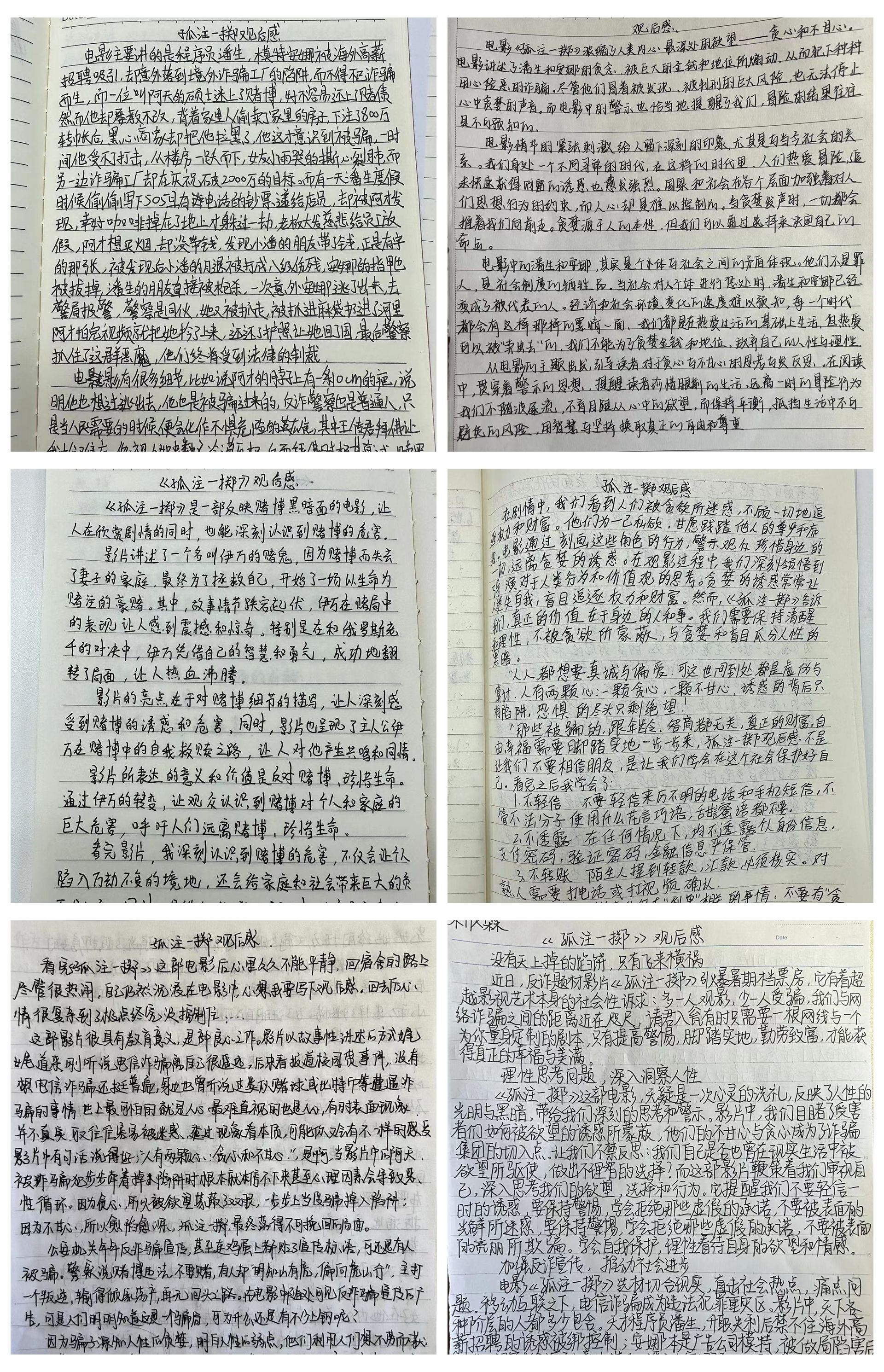 10月18日晚,基础系23级全体同学积极参加学院组织观看的电影《孤注一掷》。在观看电影后,同学们写了观后感,深刻认识到了电信诈骗的无处不在和犯罪分子的猖狂。
