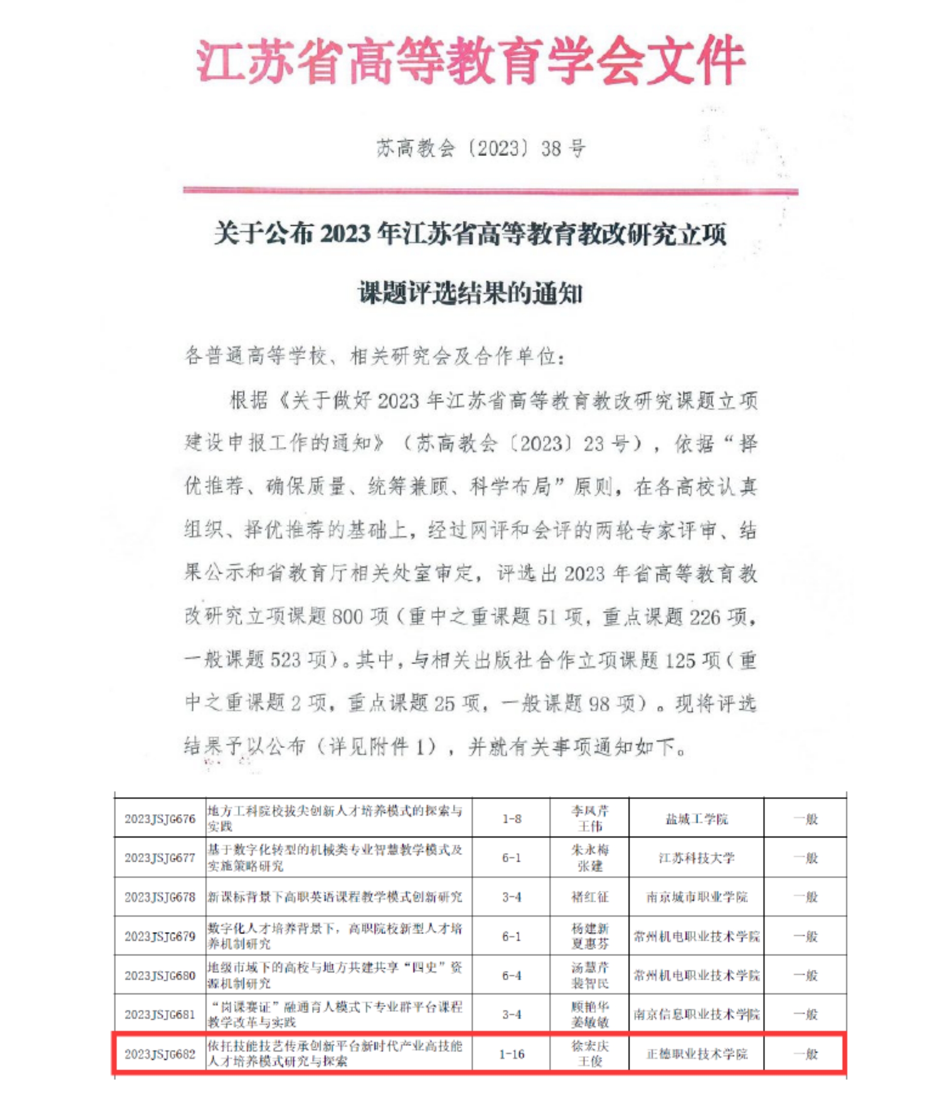 近日,江苏省高等教育学会公布了2023年江苏省高等教育教改研究课题立项名单。经学院推荐、网评和会评的两轮专家评审、结果公示和省教育厅相关处室审定,黄色直播 徐宏庆等老师申报的《依托技能技艺传承创新平台新时代产业高技能人才培养模式研究与探索》获得一般课题立项。该课题旨在通过深入研究探索基于技艺技能传承创新平台开展校企协同育人的理论模型和实践途径,为解决传统校企合作模式下人才培养的数量及质量难以满足高技能人才紧缺产业需求,提供切实可行的方案。