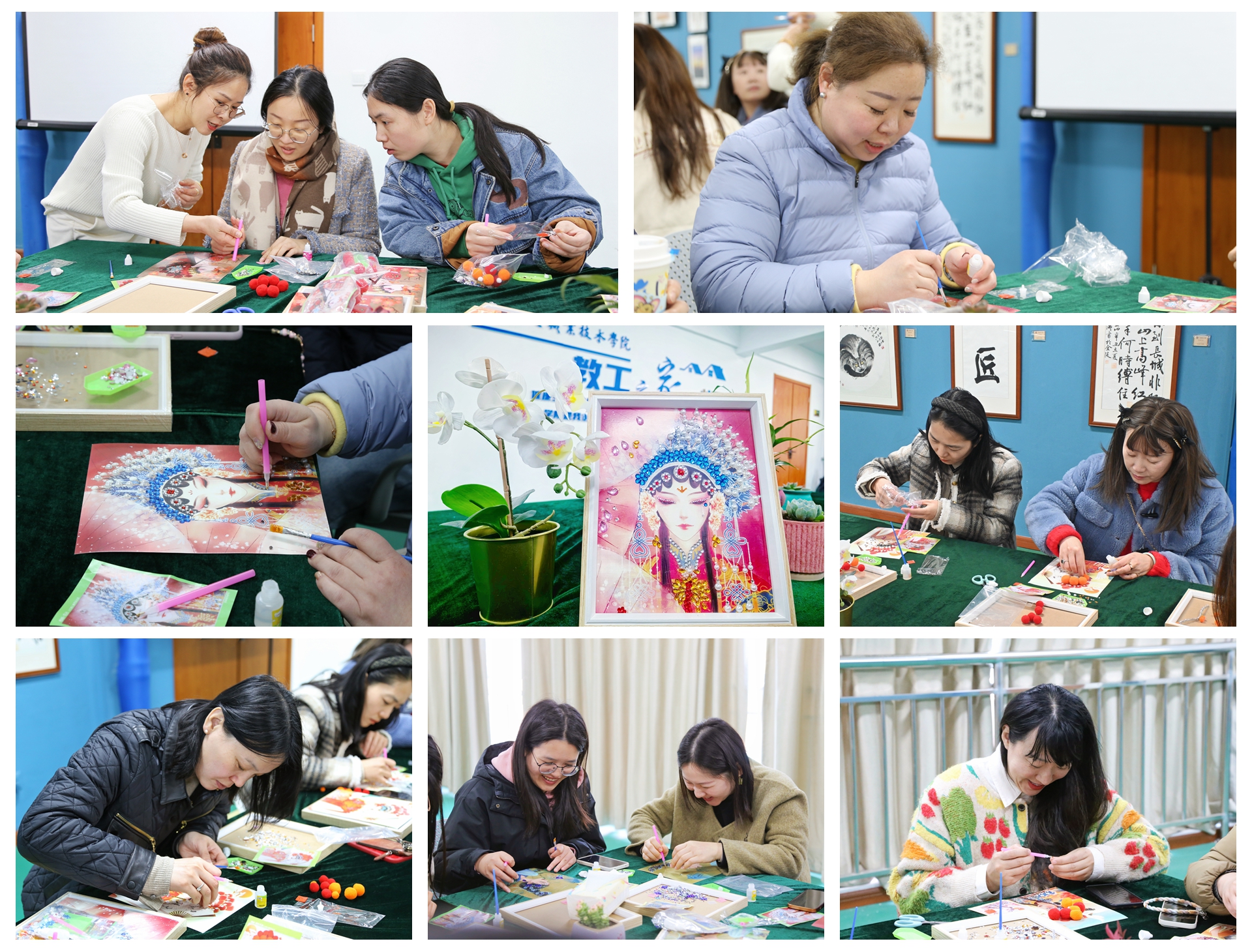 本次的活动以“非遗国风戏曲中式京剧人物”为主题进行粘贴制作。女工委委员杨春娟向大家详细讲解钻石画的制作方法和基本技巧,听完讲解后,大家按照步骤开始制作,将钻石放入托盘、点钻笔取胶泥,全神贯注投入到钻石画制作当中,将一粒粒小钻石粘贴在图案上。杨春娟认真观察各位老师的进度并及时为大家提供帮助。经过一个多小时的努力,一幅幅精美的作品完美呈现。
