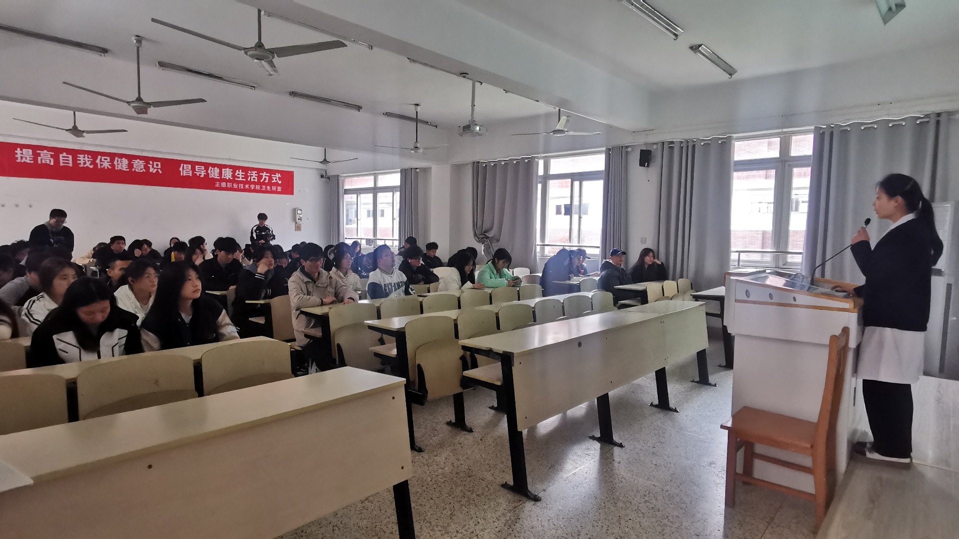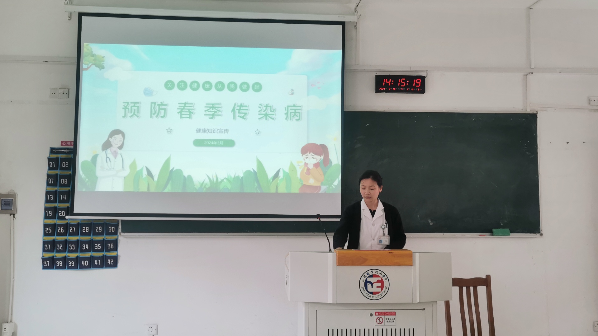 讲座现场,院卫生所护士长杨菲菲针对当前季节气候原因及社会化面传染病流行情况,从传染病的概论、春季传染病的多发病因、六种常见的校园春季传染病和传染病预防措施四个方面为大家讲解春季传染病知识。