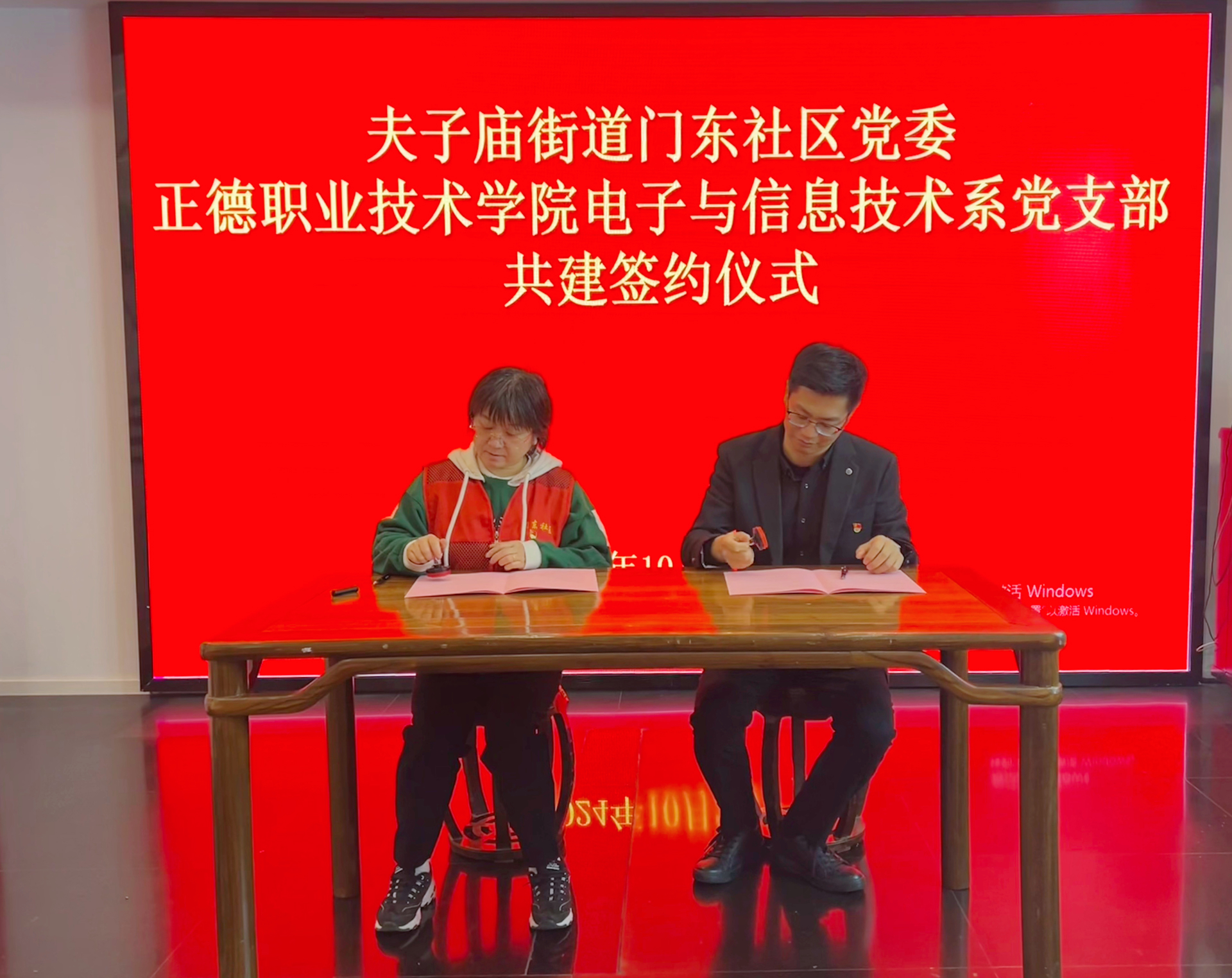 10月24日上午,电子与信息技术系党支部与夫子庙街道门东社区党委举行了“党建引领促发展 携手共建谱新篇”共建签约仪式。门东社区党委书记李薇,居委会副主任徐进,电子与信息技术系党支部书记赵欣、组织委员刘敏婧及双方党员代表等出席活动。