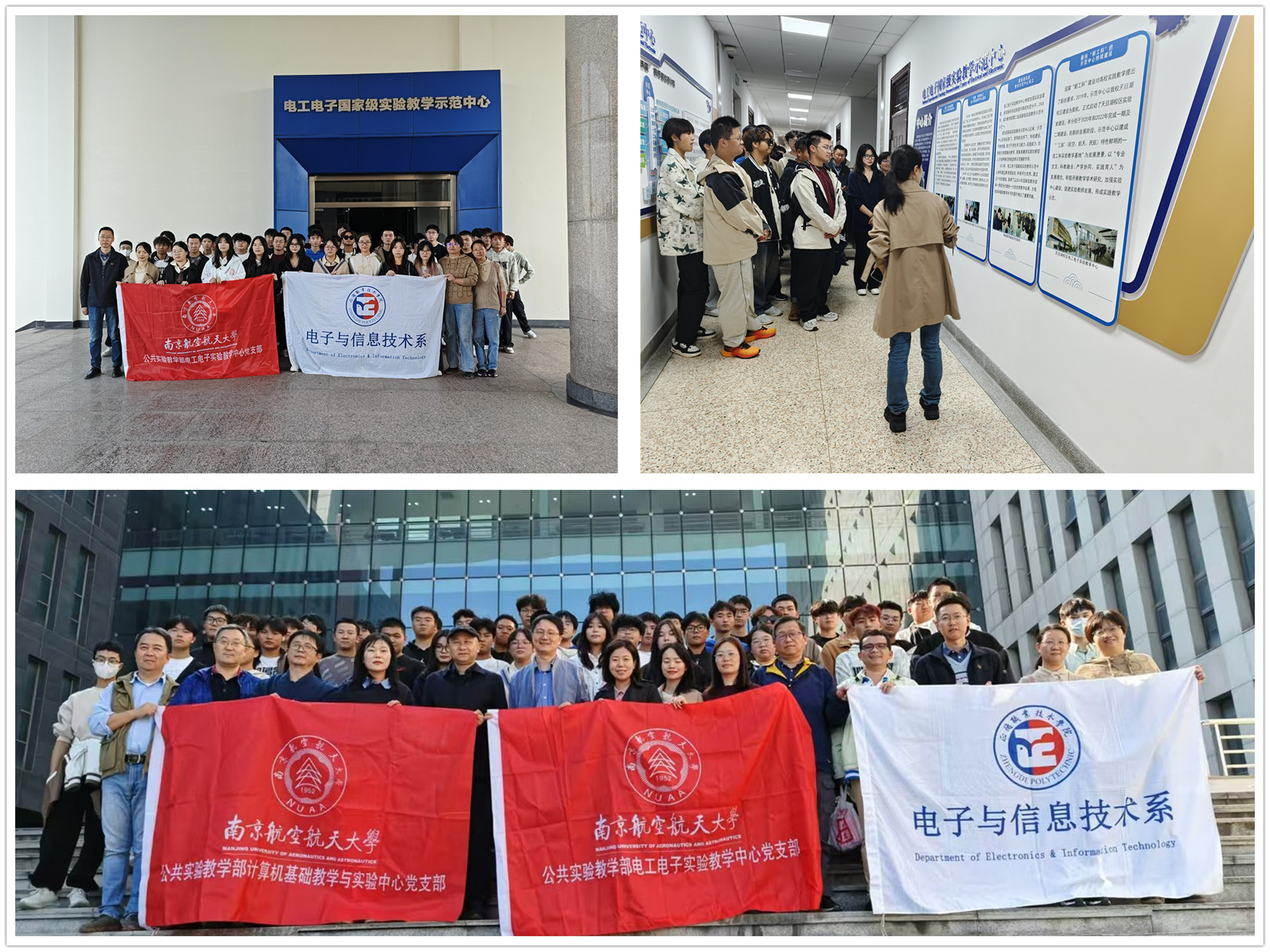 为了进一步加强学生的实践能力和综合素质,助力技术技能人才培养,近日,电子与信息技术系组织党员教师戴慧、刘婧带领2024级电子信息工程技术、计算机应用技术专业学生前往南京航空航天大学,与南京航空航天大学电工电子实验教学中心、计算机基础教学与实验中心联合开展校外实训活动。