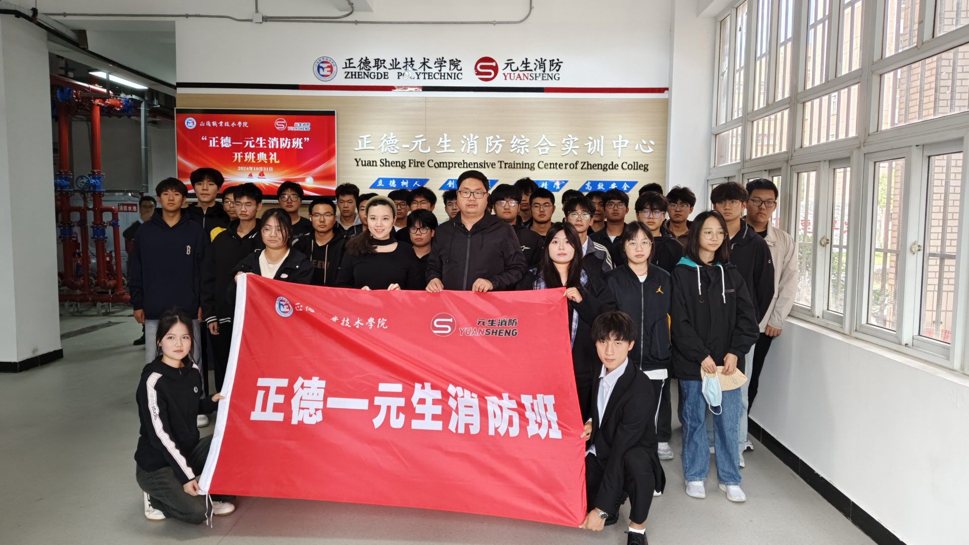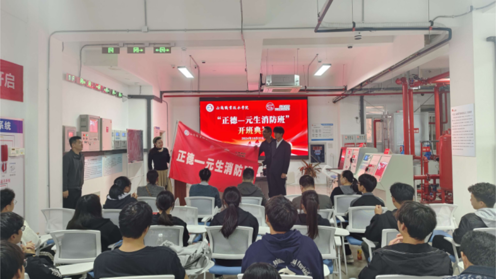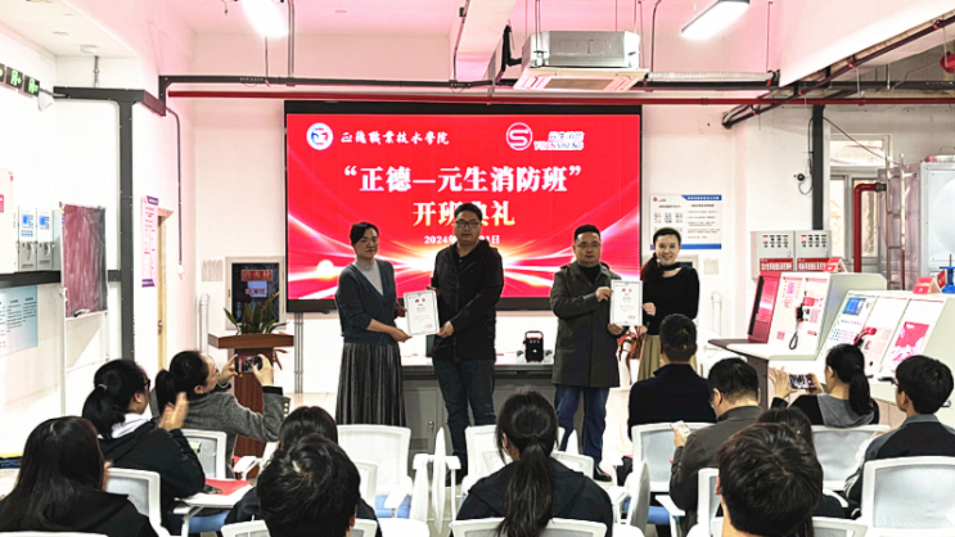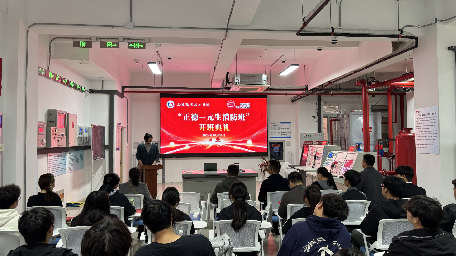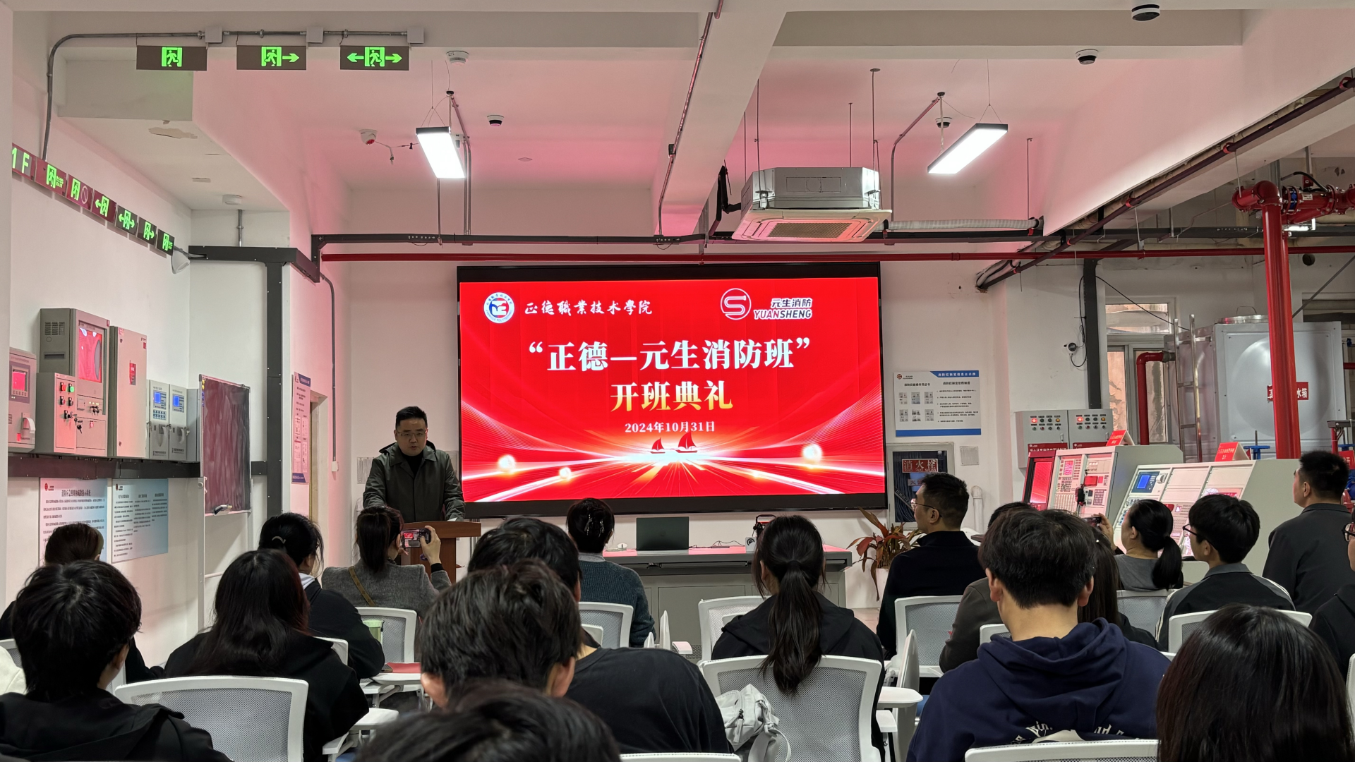 10月31日下午,“正德—元生消防班”开班仪式在正德-元生消防综合实训中心隆重举行。南京元生消防工程有限公司总经理刘臻、副总经理朱雯洁等企业代表、黄色直播 院长助理、招就处处长王墀、汽车与机电工程系系主任任丽君等老师出席活动。典礼由汽车与机电工程系系副主任虞骏卿主持。