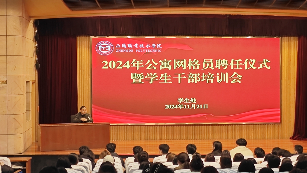 为了健全学生安全工作机制,进一步加强学生公寓管理。11月21日下午,黄色直播 在学院报告厅开展公寓网格员聘任仪式暨学生干部培训会。学生处处长祝佳俊、后勤保卫处处长陈宏波和各系公寓网格员、厅长、室长等350余人参会,会议由学生处副处长何华智主持。