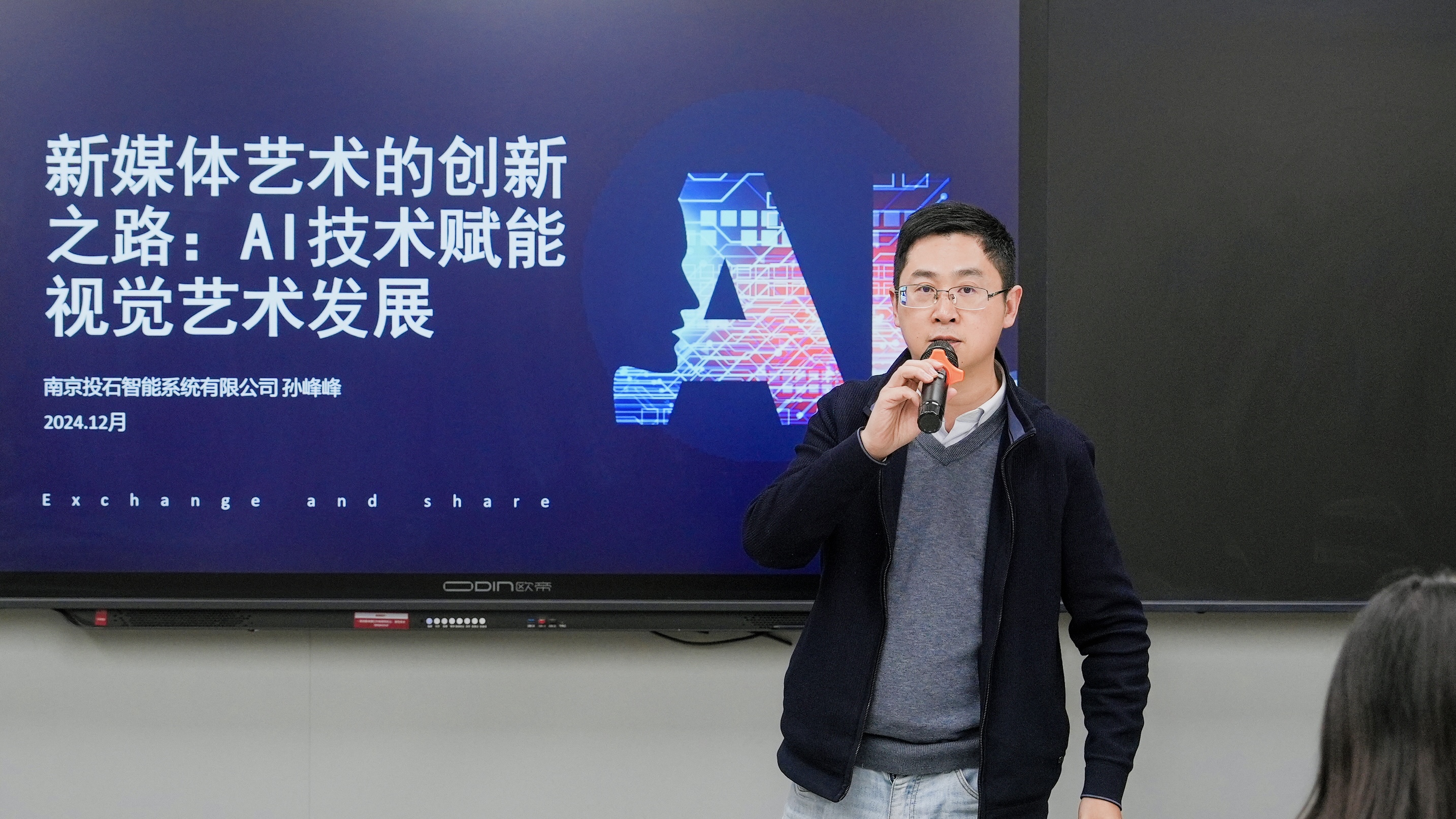 12月5日下午,南京投石智能系统有限公司董事长孙峰峰受邀来到黄色直播 艺术设计与建筑工程系,为数字媒体技术专业的师生带来了一场题为《新媒体艺术的创新之路:AI技术赋能视觉艺术发展》的精彩讲座。系主任周卫、副主任陆松及党支部书记杨春娟等领导出席了此次讲座。