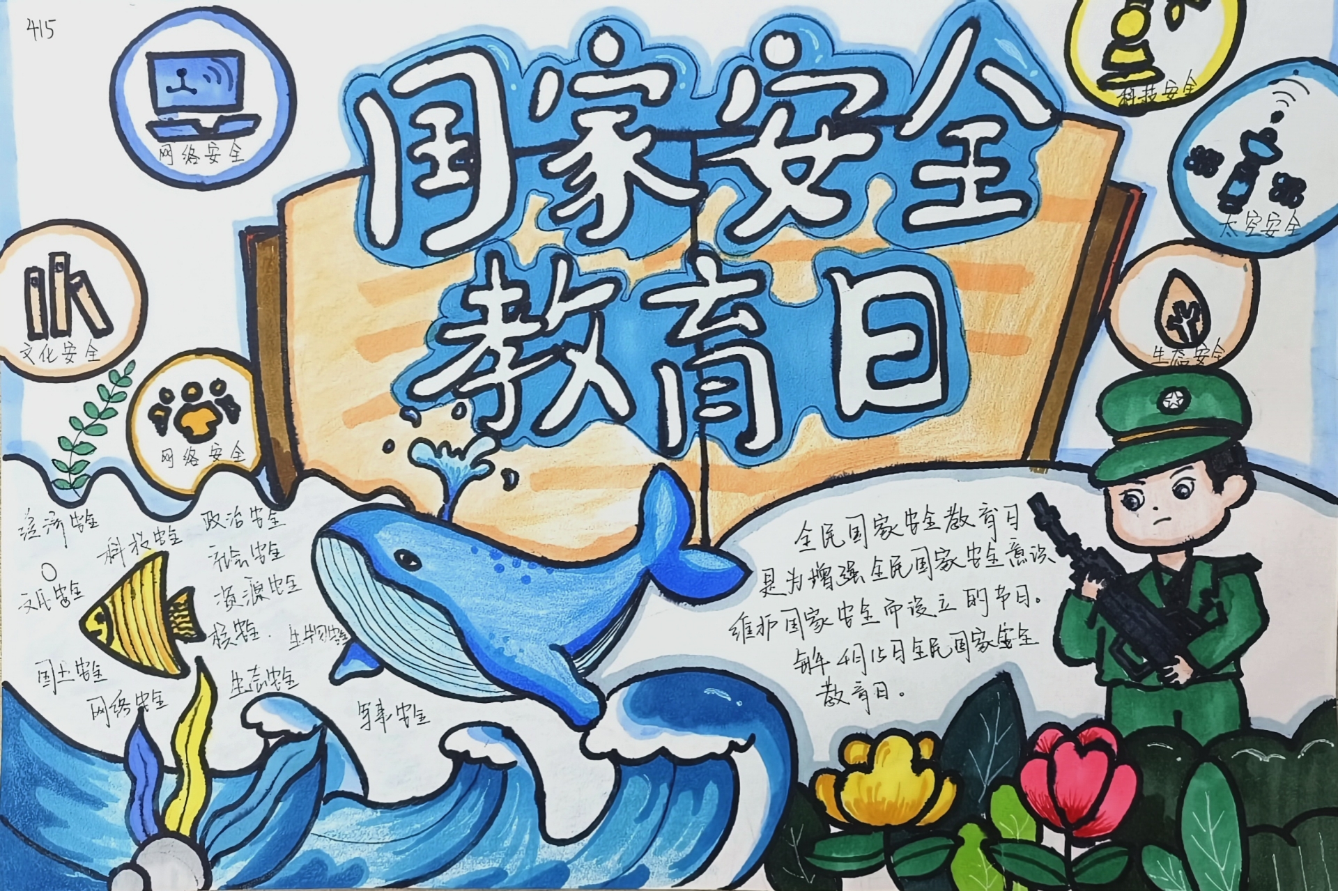 艺术设计与建筑工程系、基础教育系绘画抒怀,通过国家安全主题海报设计和手绘比赛,将国家安全观和专业技能实践融合一体,让国家安全知识随处可见、深入人心。其中艺术设计与建筑工程系李楚潇的《舌尖上的安全》、马鸣的《生态安全》两幅作品在江苏省第二届青少年总体国家安全观知识书画摄影大赛中分别获二等奖、三等奖。