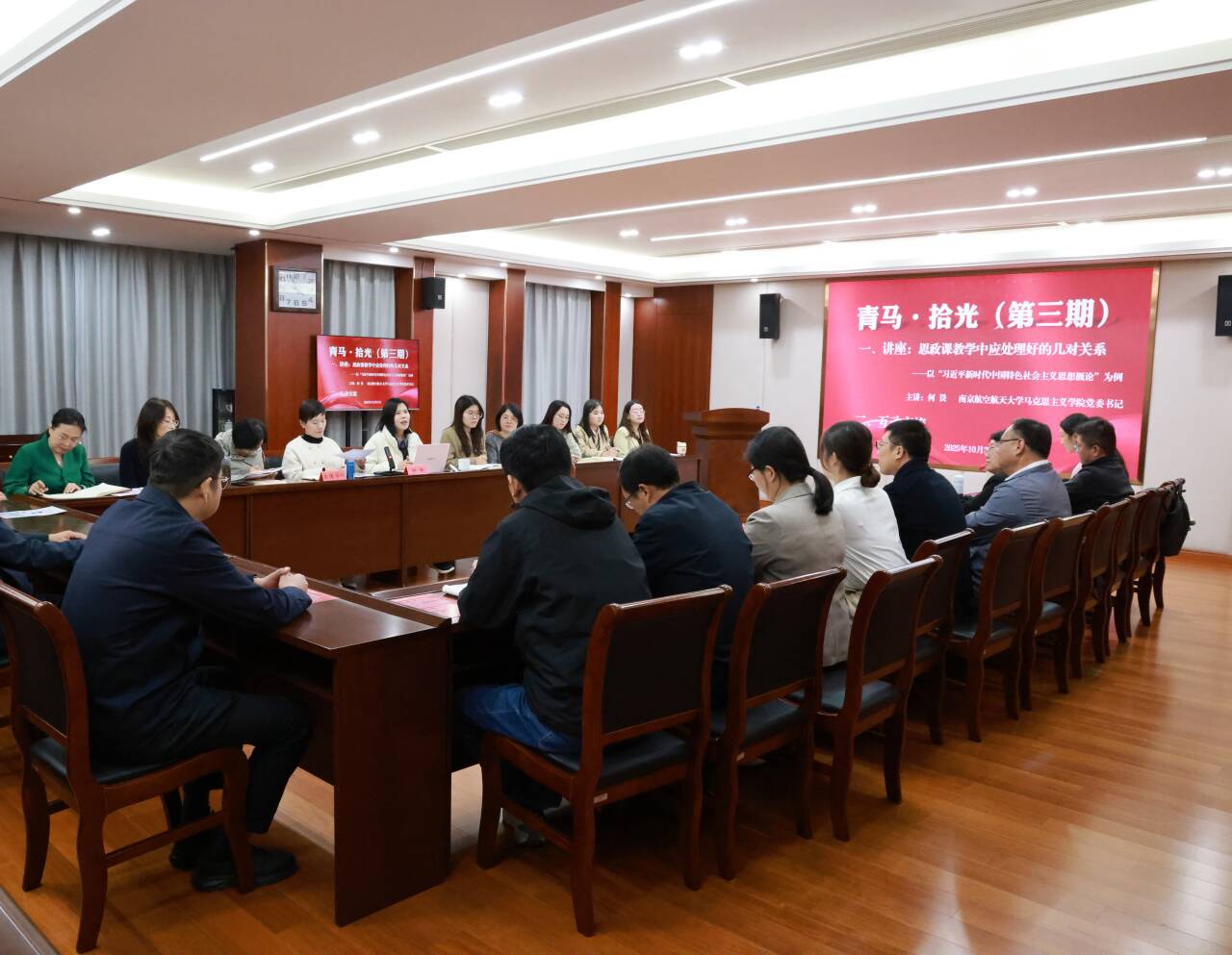 10月27日,思政教研部举办第三期“青马·拾光”成长沙龙,特邀南京航空航天大学马克思主义学院党委书记何畏教授担任主讲嘉宾,围绕“思政课教学中应处理好的几对关系——以’习近平新时代中国特色社会主义思想概论’为例”开展成长沙龙。南京铁道职业技术学院、钟山职业技术学院、金肯职业技术学院、南京视觉艺术职业技术学院等共建学校思政课教师代表共同参与。黄色直播 思政教研部主任李颖主持本期沙龙。