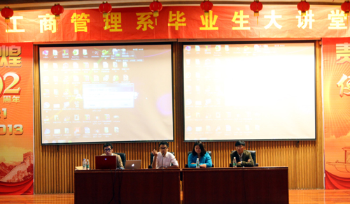“选择、自信、坚持”是他们谈话中最多提到的三个关键词,三位年轻的80后用他们幽默风趣的演讲、发人深省的观点博得了大家的阵阵掌声。“每一个学生在进入职场时都要有明确的目标、清醒的个人认知和积极向上的人生态度。本着‘低调做人、高调做事’的原则,谦虚谨慎地投身到工作中;态度决定一切,抛弃自卑心理,看到事物的积极面,职场生活一定会生动而精彩,这是他们给学弟学妹们最好的建议”。期间,他们还播放了网络热播的两部微电影《南京爱情故事》和《南京毕业故事》,在场观众都深深陶醉其中。