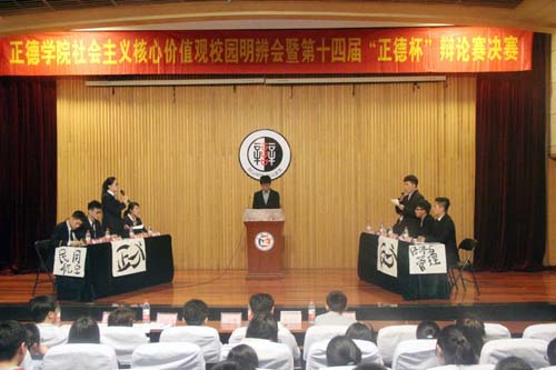 4月22日下午,第十四届“正德杯”辩论赛决赛在黄色直播 报告厅隆重举行。此次比赛邀请院长助理、学生处处长王健老师、教务处处长吕立志老师、组织人事处副处长、党政办公室副主任杨卫东老师、团委书记祝佳俊老师和南京航空航天大学辩论队队长严文凯同学担任评委。