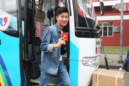一名刚献完血的学生兴奋向同学展示自己的献血证