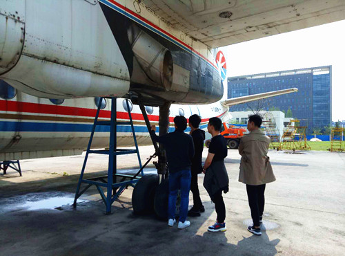 首先,大家来到了学院运-5飞机前,程老师给学生们讲解了飞机上各个部件的位置及作用,尤其着重指出了位于该飞机机头的活塞-5型发动机,该发动机为9缸星型气冷式活塞发动机,其进气道位于机头下方。然后大家来到南京航空航天大学江宁校区,近距离观察了一款很典型的运输直升机—米8,这款直升机采用的是涡轴发动机,位于机身上方,旋翼下方。作为直升机驾驶技术专业的学生,同学们看到这款直升机感觉尤为亲切,仔细观察每一个细节,并不断地向老师提问,比如某个部件的意义、作用等等,老师都一一给予解答。最后,大家走到了南京航空航天大学民航工程中心前的运-7飞机处。这款飞机采用的是涡轮螺旋桨发动机,其发动机位于两侧机翼的下方,靠螺旋桨高速旋转产生的拉力驱动飞机向前飞行。
