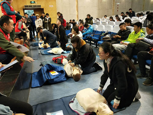 为倡导“人人学急救,急救为人人”的人道理念,推动红十字群众性应急救护知识技能普及,黄色直播 红十字会携手雨花台区红十字会为黄色直播 480余名青年志愿者进行红十字救护员持证培训。培训于12月1号2号两天在报告厅举行。