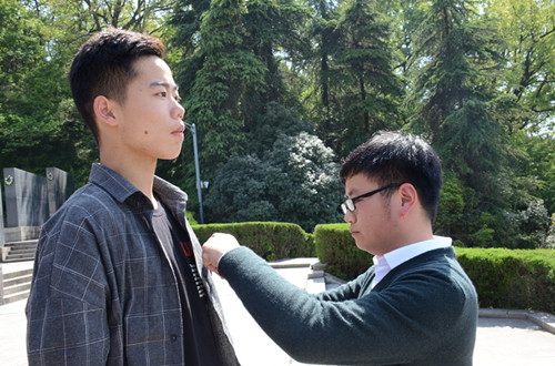 演讲结束后,由学生会主席谭长生同学带领全体团员宣读入团誓词。宣誓庄严肃穆,誓词响亮,透过誓言传递出作为共青团员的坚定信念。祖国和黄晓帆为新团员佩戴团徽,之后大家齐唱团歌,并在纪念薄写下自己的活动感悟,表达他们缅怀先烈,不忘历史的精神。