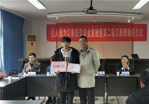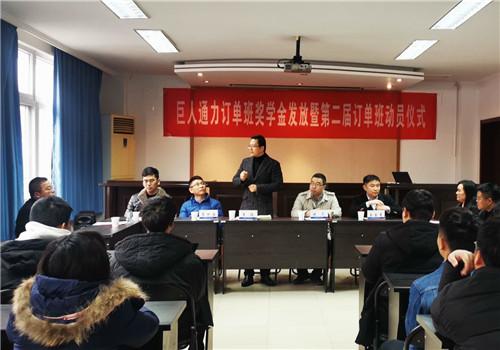 会上,任丽君首先宣读了巨人通力订单班奖学金名单,并由巨人通力公司人力总监陈亮、运营经理金金夏、经理李世和王俊、祖国、王磊共同为获奖学生颁发荣誉证书及奖学金,并对获奖同学表示衷心祝贺。随后,王俊讲话,他希望获奖同学在工作岗位上要发扬工匠精神,时刻牢记学校的嘱托,在新的岗位上获得更大进步。