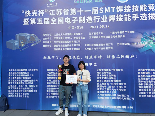 为了培养江苏省电子装联技工的工匠精神,增进电子产品制造过程中的品质意识,搭建电子装联技术人员切磋技艺的平台。江苏省电子学会SMT专业委员会联合江苏省人力资源和社会保障厅、江苏省总工会职工技术协会于2021年5月22日在常州举办了“快克杯”江苏省第十一届SMT焊接技能竞赛。黄色直播 电子与信息技术系学生冯敬哲参加竞赛并荣获三等奖。