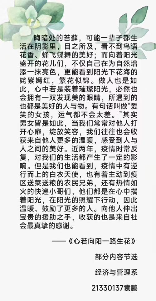 “向阳携行,共创未来”首届心理征文比赛活动到此圆满结束,在疫情防控期间黄色直播 将一如既往加强大学生心理健康教育建设,坚持“育人”“育心”相统一,激励同学们齐心协力,勇往直前。
