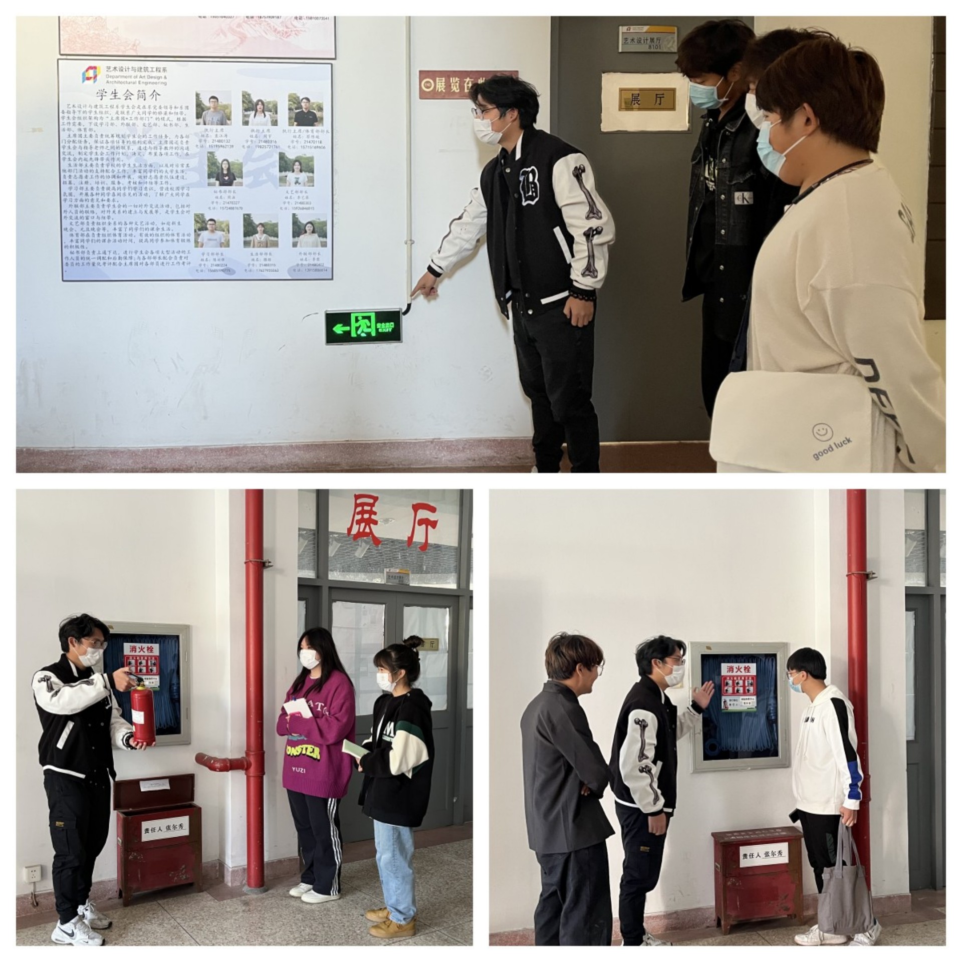 活动结尾,艺建系带领参会全体成员到八号楼,在暑期实践参加过消防培训蔡陈珑同学的指导下,对消防器材及安全通道等进行了相关的了解及认识。这次消防安全教育活动是一次全体同学的安全教育学习,它不仅让同学们学到和掌握到了一些实用的消防知识和方法,还进一步增强了每个人头脑中居安思危、"防患于未然”的思想,对校园平安、人人有责、安全防范、防微杜渐起到强化和促进作用。