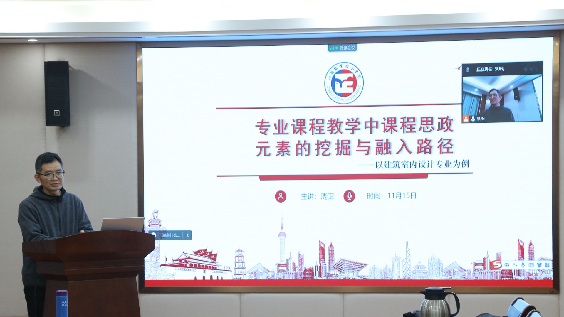 周卫老师的培训主题为“专业课程教学中课程思政元素的挖掘与融入路径——以建筑室内设计专业为例”。周老师结合自身建筑室内设计专业从开展课程思政的必要性、课程思政教学改革理念与整体思路、课程思政改革举措、课程思政元素的挖掘和融入路径等方面,从课程、毕业设计、技能竞赛、实习实训等不同角度,生动形象地为老师们讲解了将思政元素有机融入专业教学与育人的方式方法,指导老师们要根据不同专业人才培养特点设计和开发融入教学内容的课程思政元素,潜移默化地对学生进行价值引领,做到润物细无声。