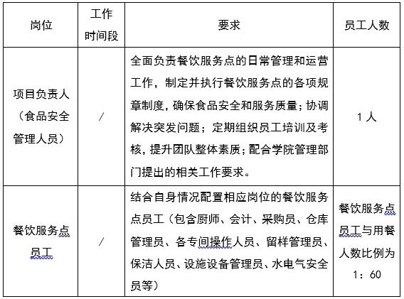 (2)人员配置:需满足师生一日三餐的餐饮服务需要。