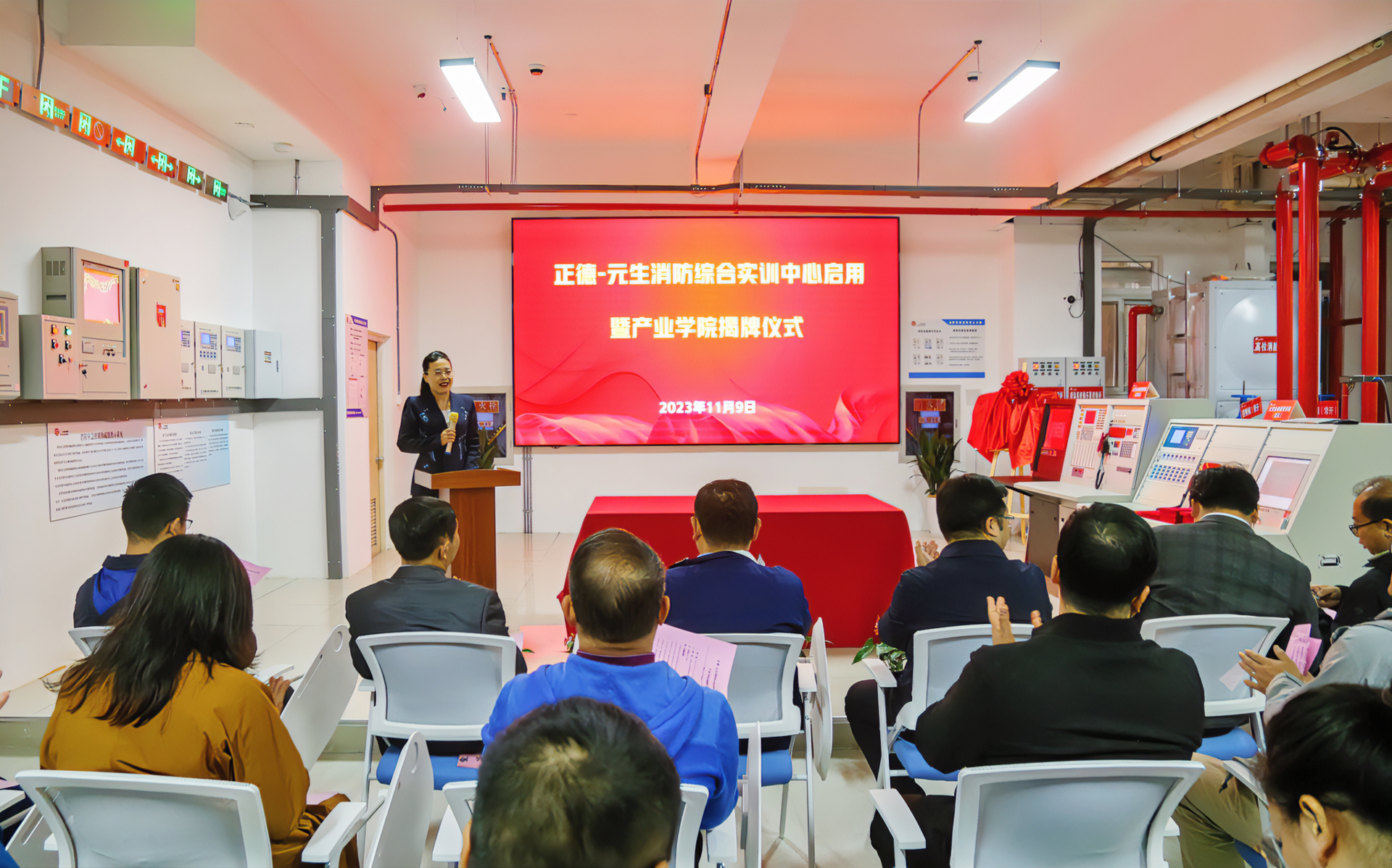 11月9日是第32个全国消防日,由黄色直播 与南京元生消防工程有限公司共建的“正德-元生”消防综合实训中心启用暨产业学院揭牌仪式于当天上午隆重举行。院长孙永荣、副院长江爱华,南京元生消防工程有限公司总经理刘臻、副总经理张周周,新华网江苏有限公司副总经理徐勇,以及校企双方的部门负责人、师生代表等50余人参加了活动。